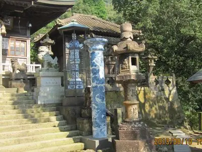 佐賀方面、車での神社めぐり、7社めは焼き物の町、有田市に鎮座する陶山神社です。主祭神は応神天皇ですが、名前に陶の字があるように、有田焼の陶祖神、李参平公を相殿神としています。神社へ到着する前に有田市の市街地を車で走り抜けましたが、道路の両脇に陶器屋さんがずらりと並び壮観でした。陶山神社は、そんな町並みの中央付近から少し山間に入ったところに鎮座しております。驚いたことに、参道の階段を登ったところにJR佐世保線がはしっていて、境内を鉄道が分断しているような形になっています。電車が通過する時には、まるで境内を電車が走っているように見えます。そんな境内の先に、急峻な階段があり、階段を登ると磁器製の鳥居が迎えてくれます。佐賀の松原神社にあった陶器の鳥居と似ているような気もします。そして、その先には、さすがは有田焼の陶祖神、陶磁器の大釜や、灯篭、そして湊八坂神社や淀姫神社にあった陶器の狛犬とはまた違った、白磁の見事な狛犬、さらには、本殿の欄干も磁器でできていました。お守りや絵馬も陶器製のものがあり、後で知ったのですが、マイお守りとして、名前を入れてくれる陶器のお守りも販売しているそうです。御朱印は、階段下の社務所で頂きました。