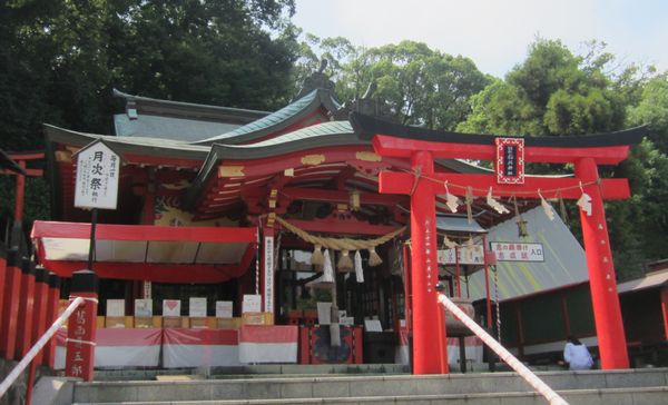熊本市内神社巡り、11社めは熊本城稲荷神社です。加藤清正が建立したそうで、熊本城の城内といってもよく、堀のかわりの川と城壁の間に鎮座しています。境内は、それほど広くはないのですが、稲荷神社の朱色のにぎやかさと、沢山の摂社/末社があるのが特徴です。また、狛犬とお稲荷さんのきつねが並んで座っており、あまり見たことが無い光景でした。お守りの自動販売機も初めてです。