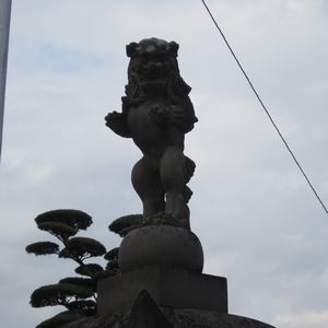 燈籠の上で曲芸をする狛犬さん