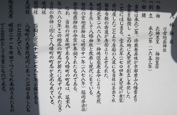 長崎市神社巡り、6社めは宮地嶽八幡神社です。伊勢宮から歩いて2,3分のところに鎮座しています。ここにはめずらしい、陶器製の鳥居が立っています。これまで参拝した中では、佐賀市の松原神社、有田市の陶山神社に陶器製の鳥居がありました。それらに比べるとチョット痛みがひどく、裏側から補強されていました。拝殿はしっかりしていましたが、本殿はなく、周りは駐車場となっていて、都市化によって境内が狭められてしまったように思われます。時代の流れでしょうか。社務所、宮司さん宅らしき建物も見当たらず、御朱印は頂けませんでした。