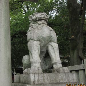 鳥居の前の狛犬さん、正面を向いています。