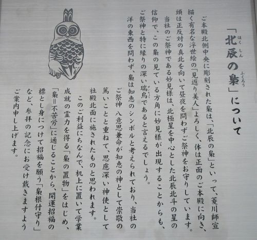 本殿裏側、「北辰の梟」の彫刻があります。