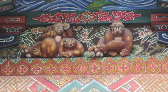 本殿左側の彫刻、「お元気三猿」