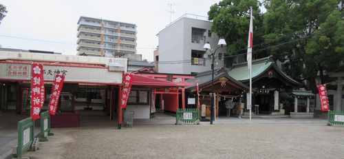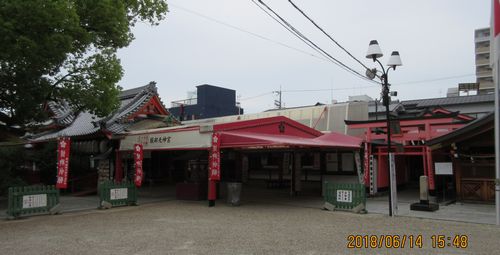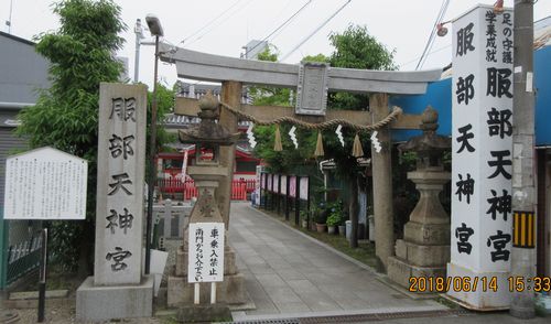 岡町駅から二つめの駅、服部天神駅下車、駅名がそのままになっています。本日6社め、服部天神宮に参拝しました。駅から歩いていくと、裏側からの参拝になります。一旦境内を横切り、改めて正面から参拝します。天神宮ですから、菅原の道真を祀っているのですが、どうして学問の神様ではなくて足の神様なのかと思ったら、由緒に書かれていました。その昔、菅原道真公が大宰府に向かう途中、この地で持病の脚気が悪化、一歩も歩けなくなり、この地で平癒したとのことだそうです。丁度ワールドカップの直前、足の神様だけに、翌日日本の必勝祈願祭が行われるところでした。果たしてご利益はあったのかどうか??